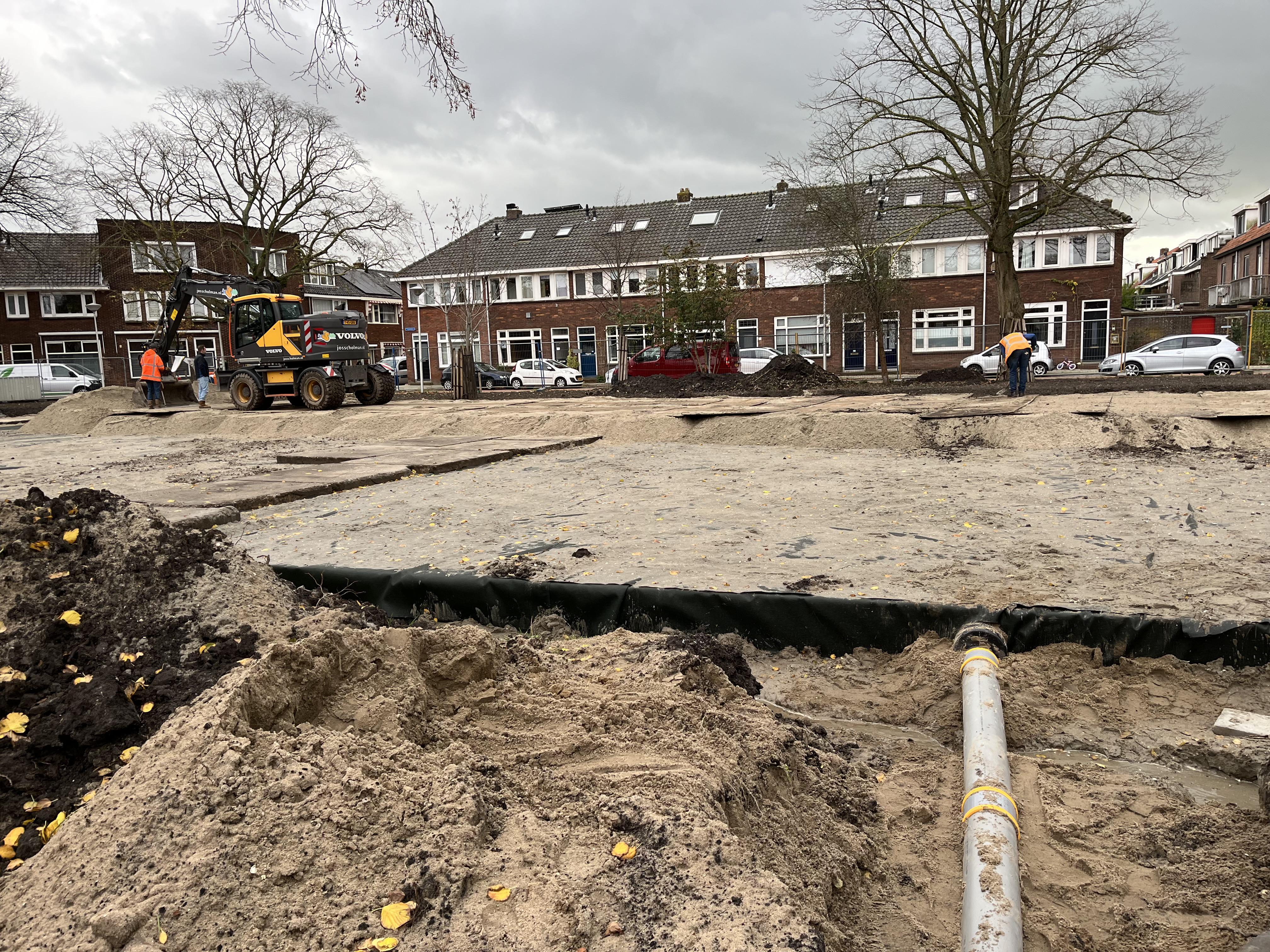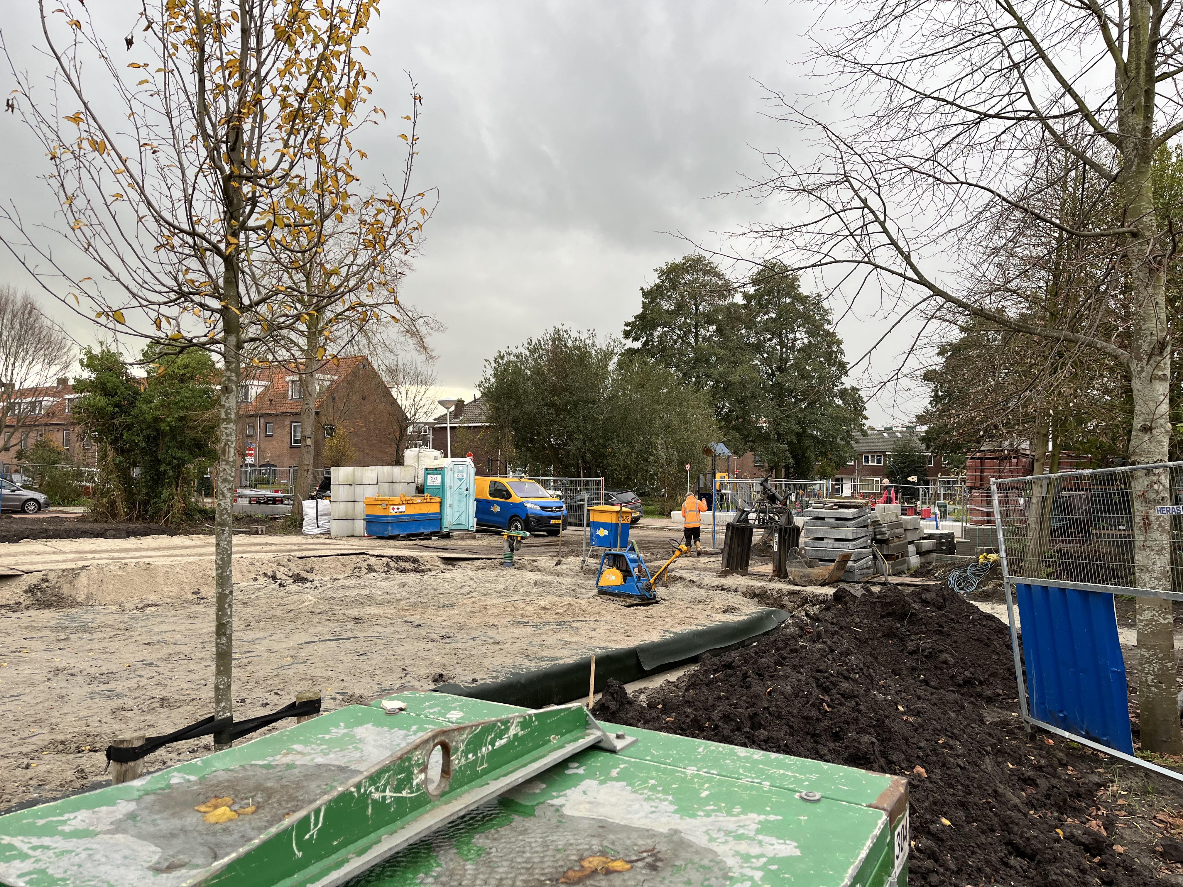 Nu onze werkzaamheden in de Walvisstraat er al even opzitten, ligt onze focus nu bij het krattenveld onder het Vogelplein. Dit schiet al mooi op! Zoals op de foto’s te zien is, werken wij toe naar het opbouwen van de definitieve situatie. Zo komt hier uiteindelijk een kunstgras voetbalveld.